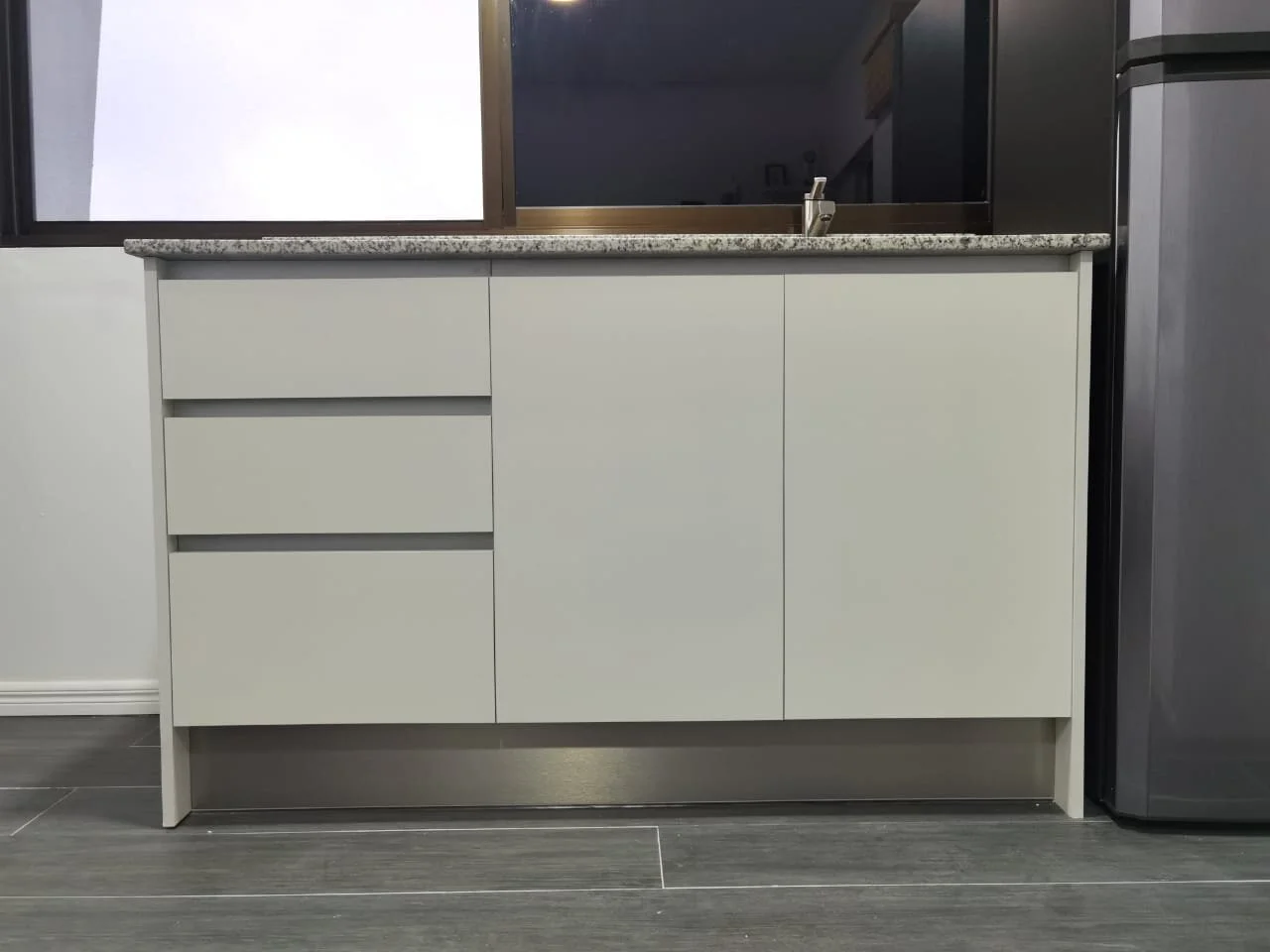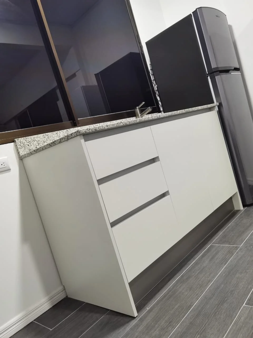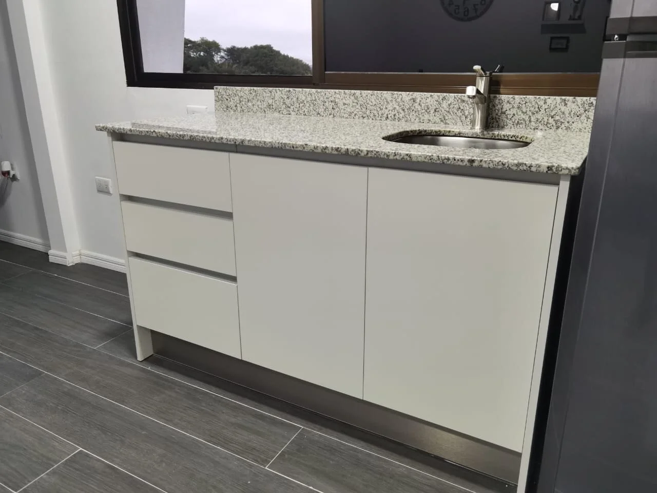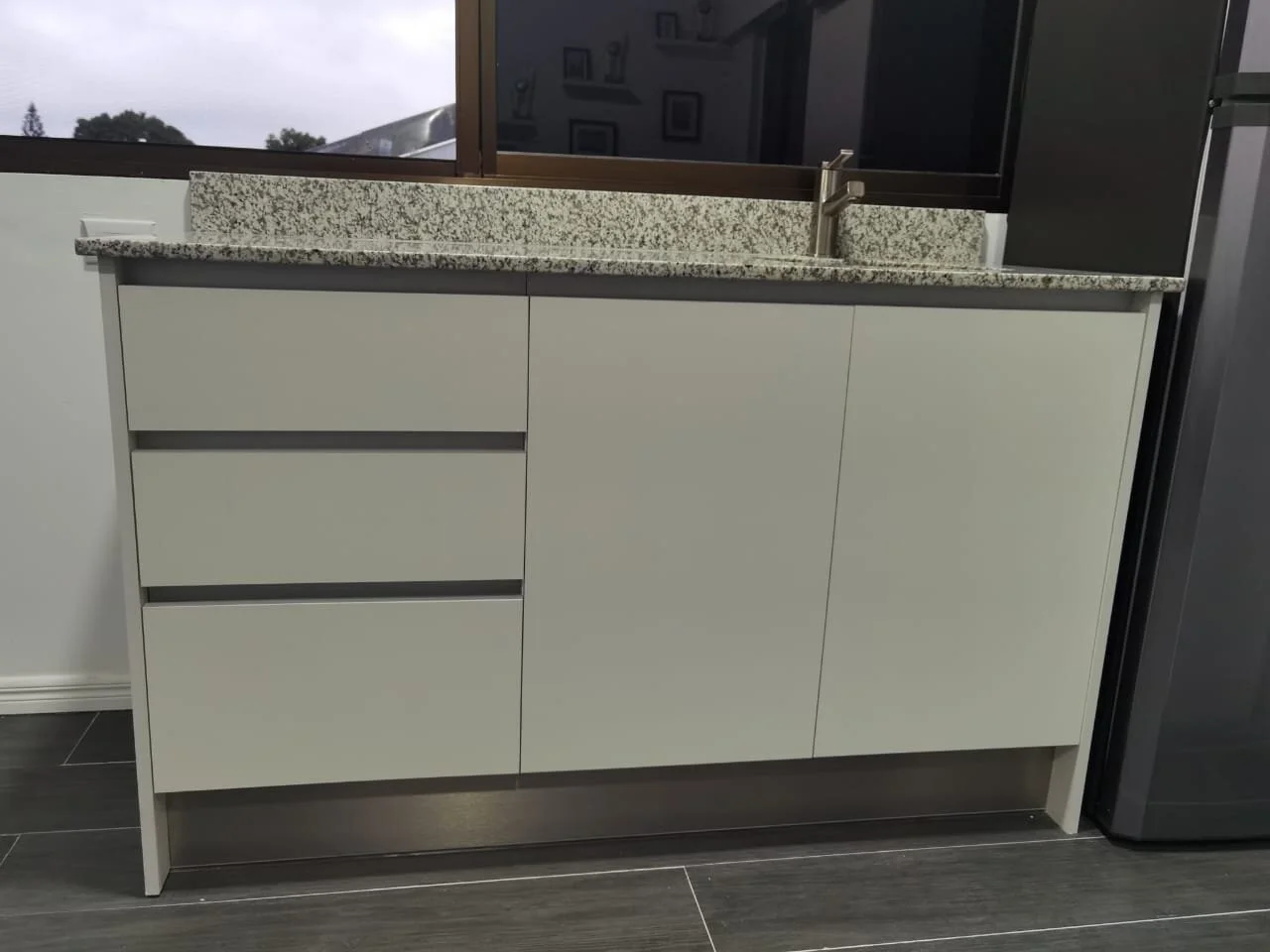 MUEBLE DE COCINA CON HERRAJES BLUM / CUERPOS DE LOS MUEBLES EN 18MM HIDRÓFUGO BLANCO / CHAPETA 2MM / RODAPIE DE ALUMINIO / PATAS PLÁSTICAS / MÓDULOS ESPECIALES / TODO CON CIERRE LENTO / HERRAJE GOLAS / RODAPIÉ EN ALUMNIO / PUERTAS CON BISAGRAS SOFT CLOSE