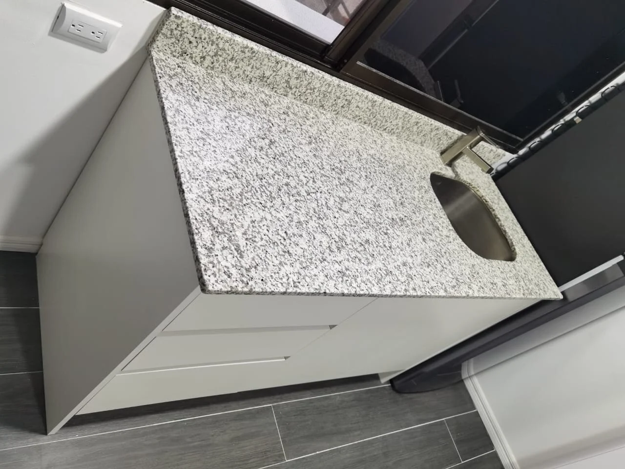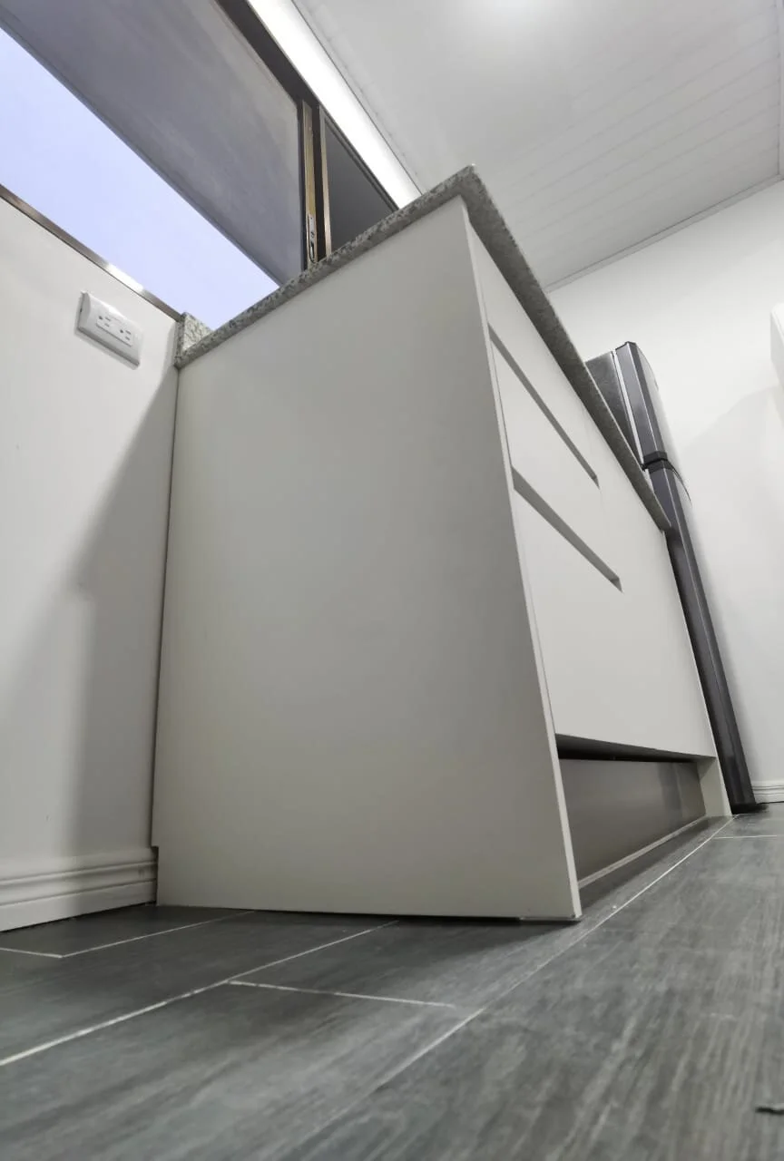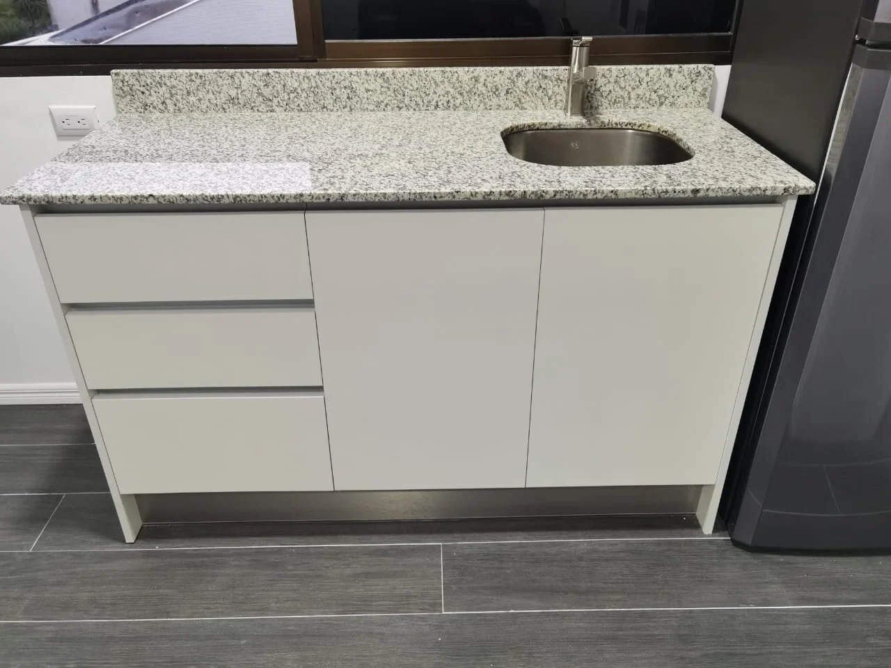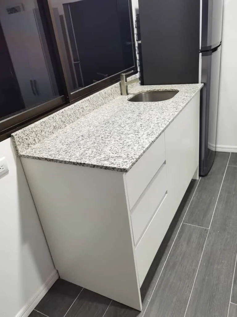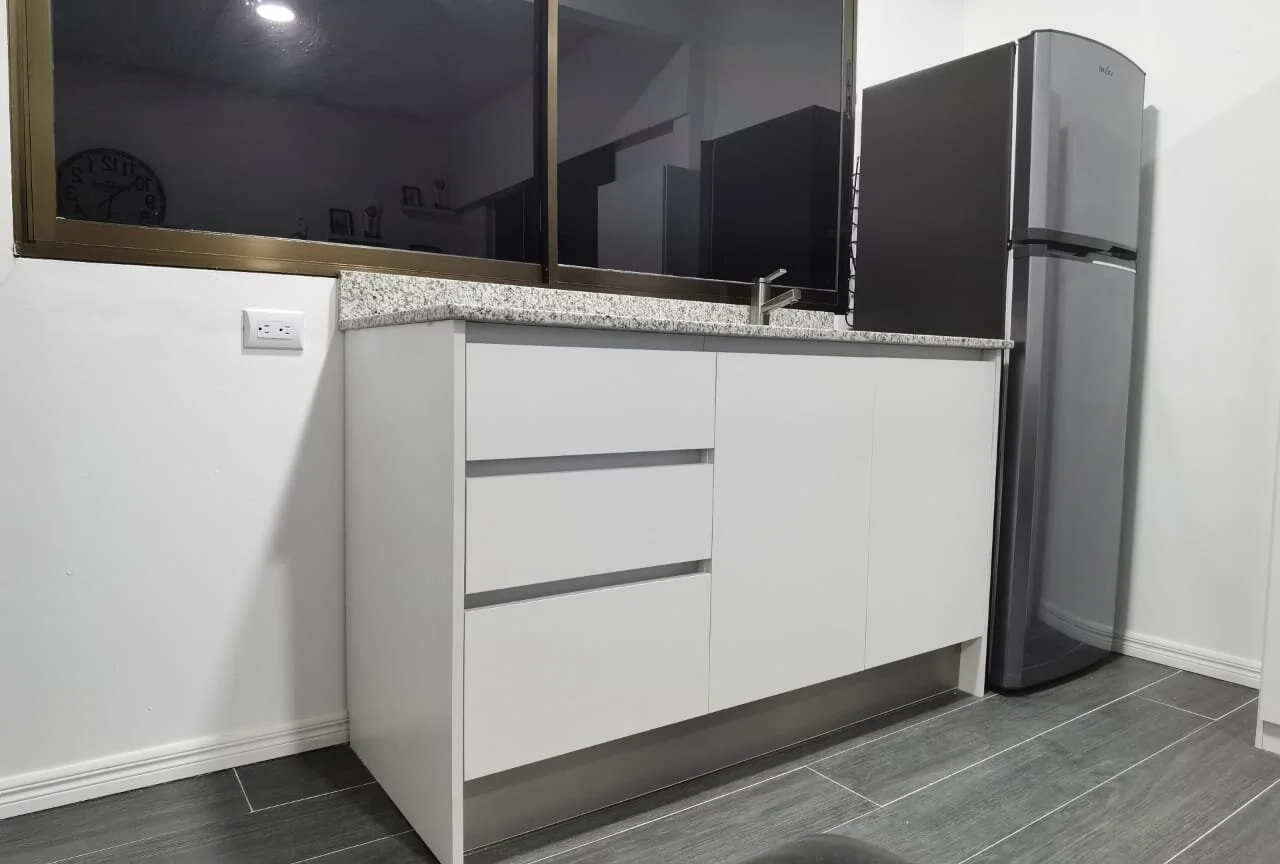 MUEBLE DE COCINA CON HERRAJES BLUM / CUERPOS DE LOS MUEBLES EN 18MM HIDRÓFUGO BLANCO / CHAPETA 2MM / RODAPIE DE ALUMINIO / PATAS PLÁSTICAS / MÓDULOS ESPECIALES / TODO CON CIERRE LENTO / HERRAJE GOLAS / RODAPIÉ EN ALUMNIO / PUERTAS CON BISAGRAS SOFT CLOSE