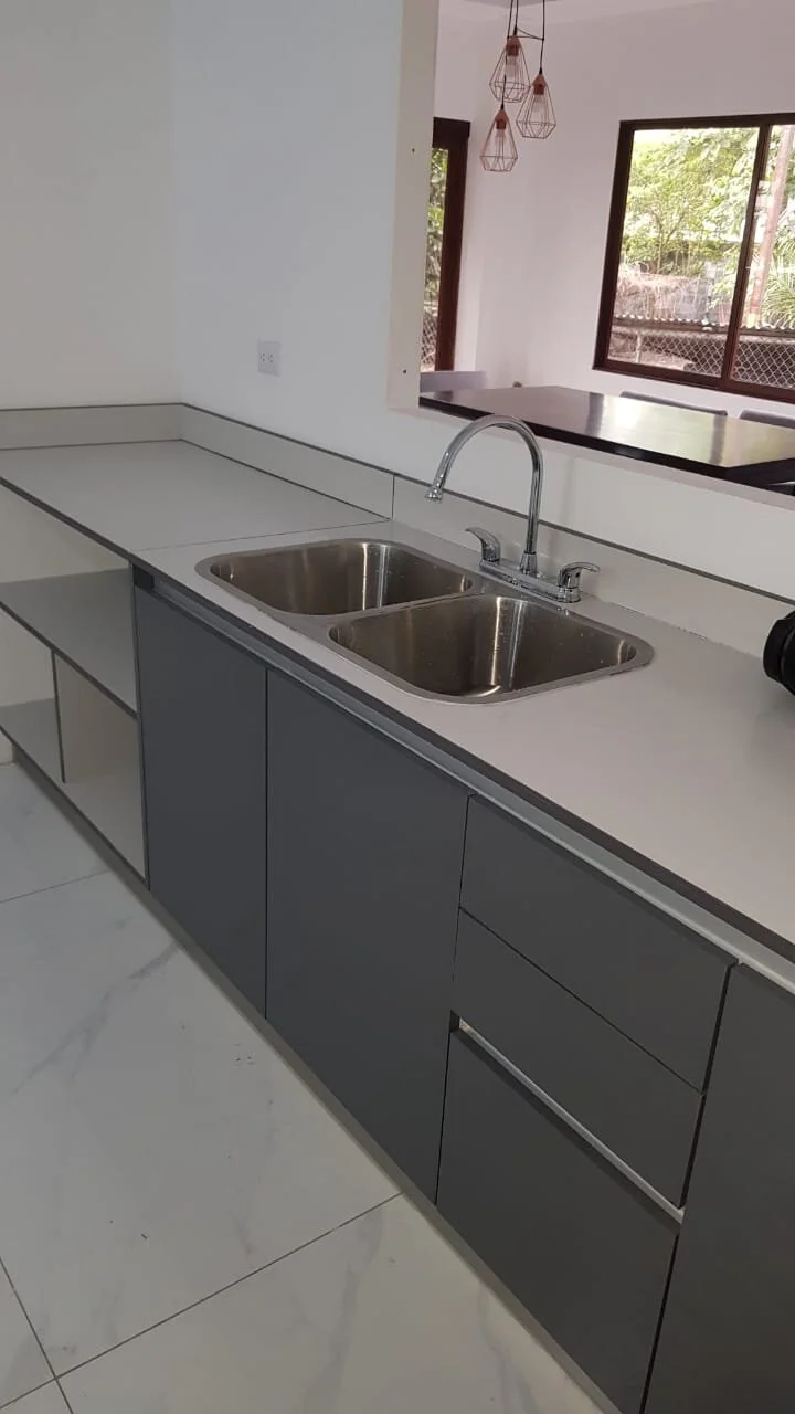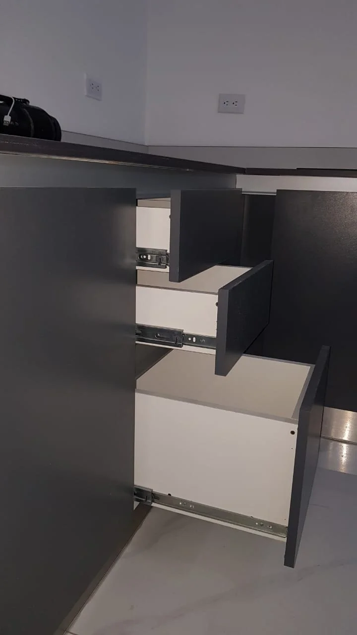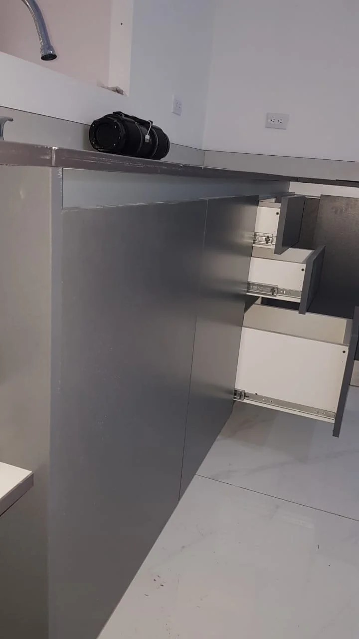 MUEBLE DE COCINA CON HERRAJES BLUM / CUERPOS DE LOS MUEBLES EN 18MM HIDROFUGO COLOR GRIS / CHAPETA 2MM / RODAPIE DE ALUMINIO / PATAS PLÁSTICAS / MÓDULOS ESPECIALES / TODO CON CIERRE LENTO / HERRAJE GOLAS / RODAPIE EN ALUMNIO / PUERTAS CON BISAGRAS SOFT CLOSE