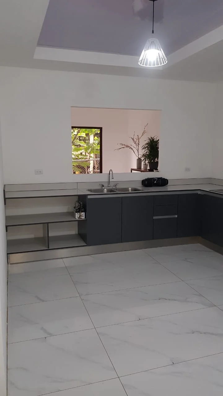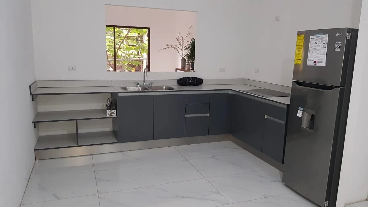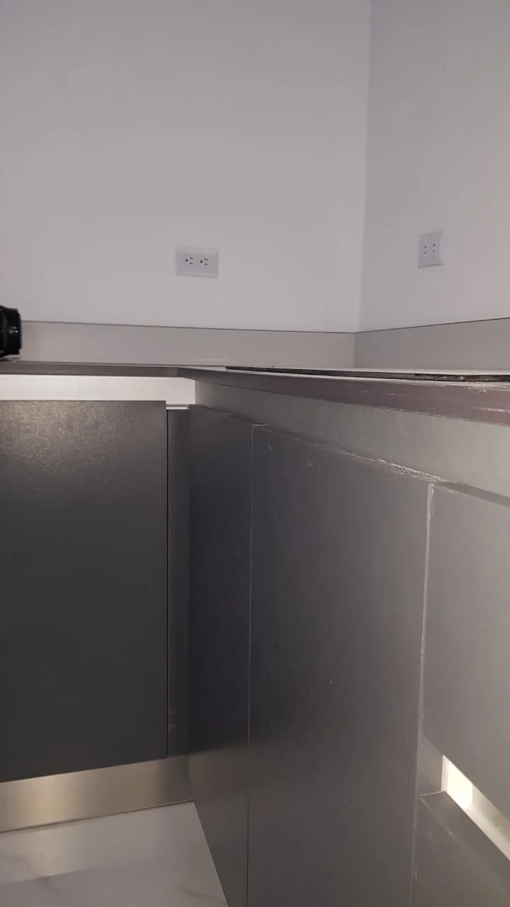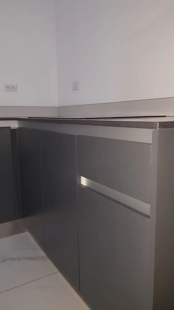 MUEBLE DE COCINA CON HERRAJES BLUM / CUERPOS DE LOS MUEBLES EN 18MM HIDROFUGO COLOR GRIS / CHAPETA 2MM / RODAPIE DE ALUMINIO / PATAS PLÁSTICAS / MÓDULOS ESPECIALES / TODO CON CIERRE LENTO / HERRAJE GOLAS / RODAPIE EN ALUMNIO / PUERTAS CON BISAGRAS SOFT CLOSE