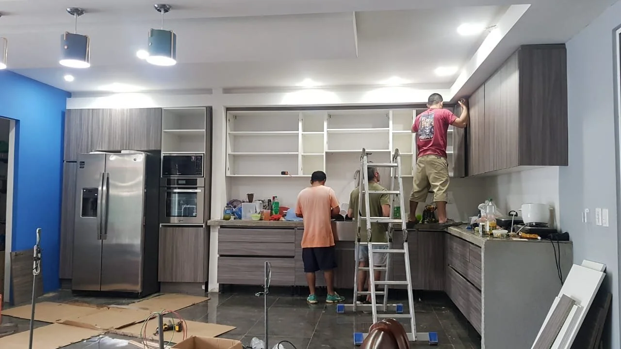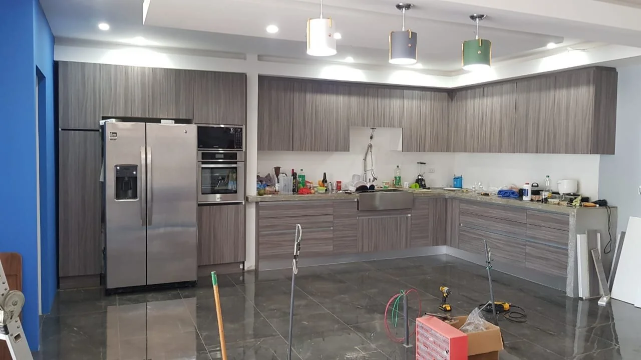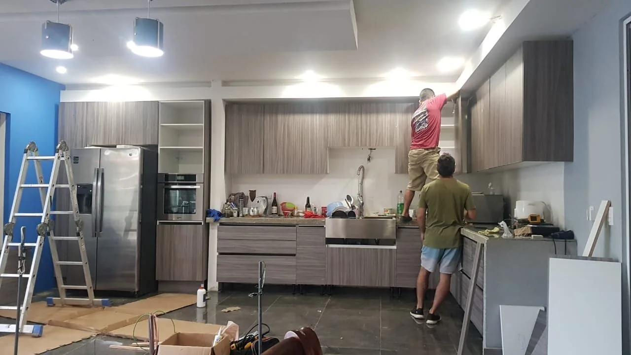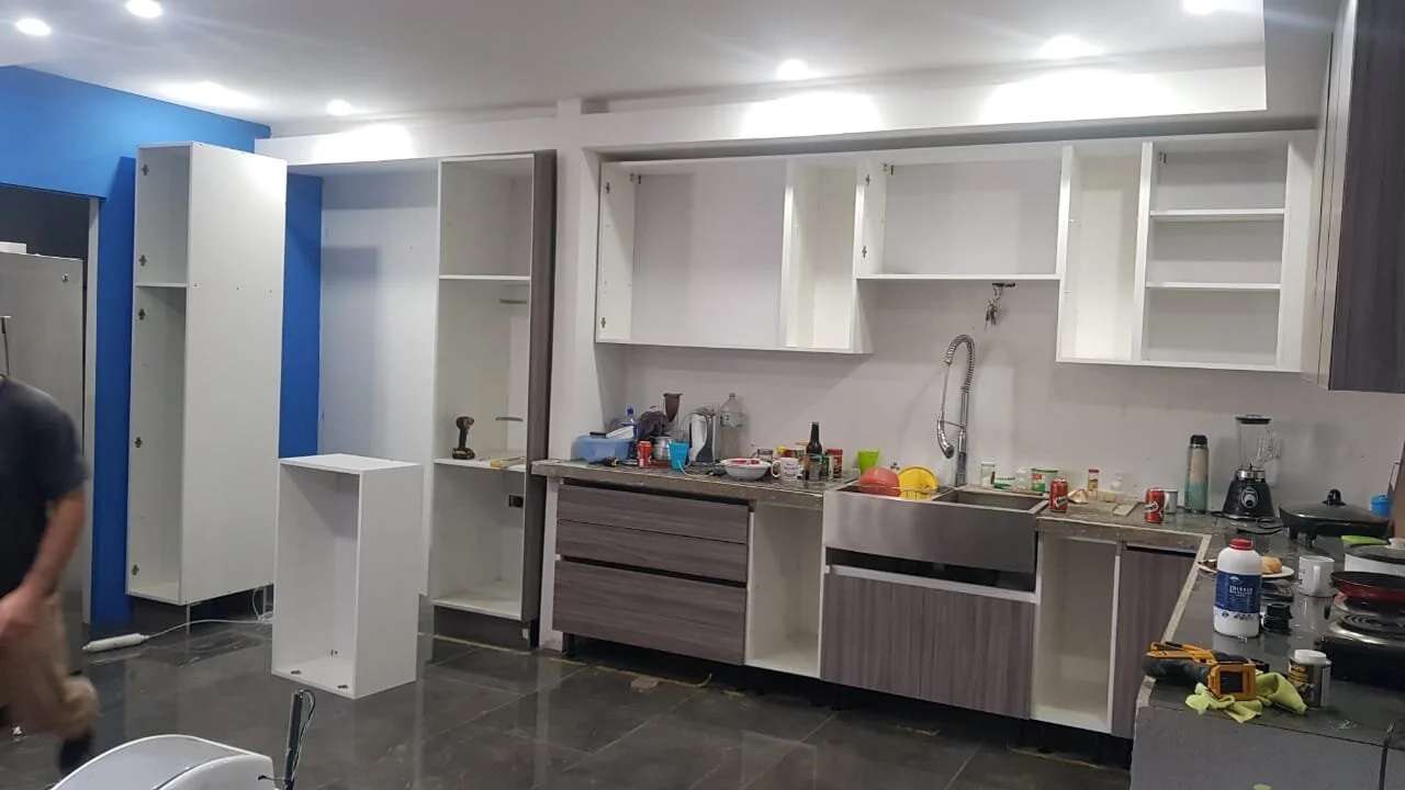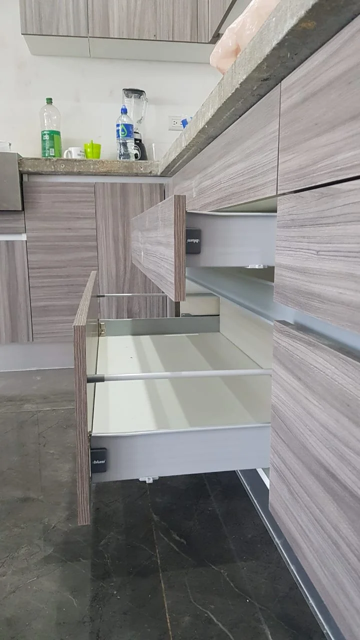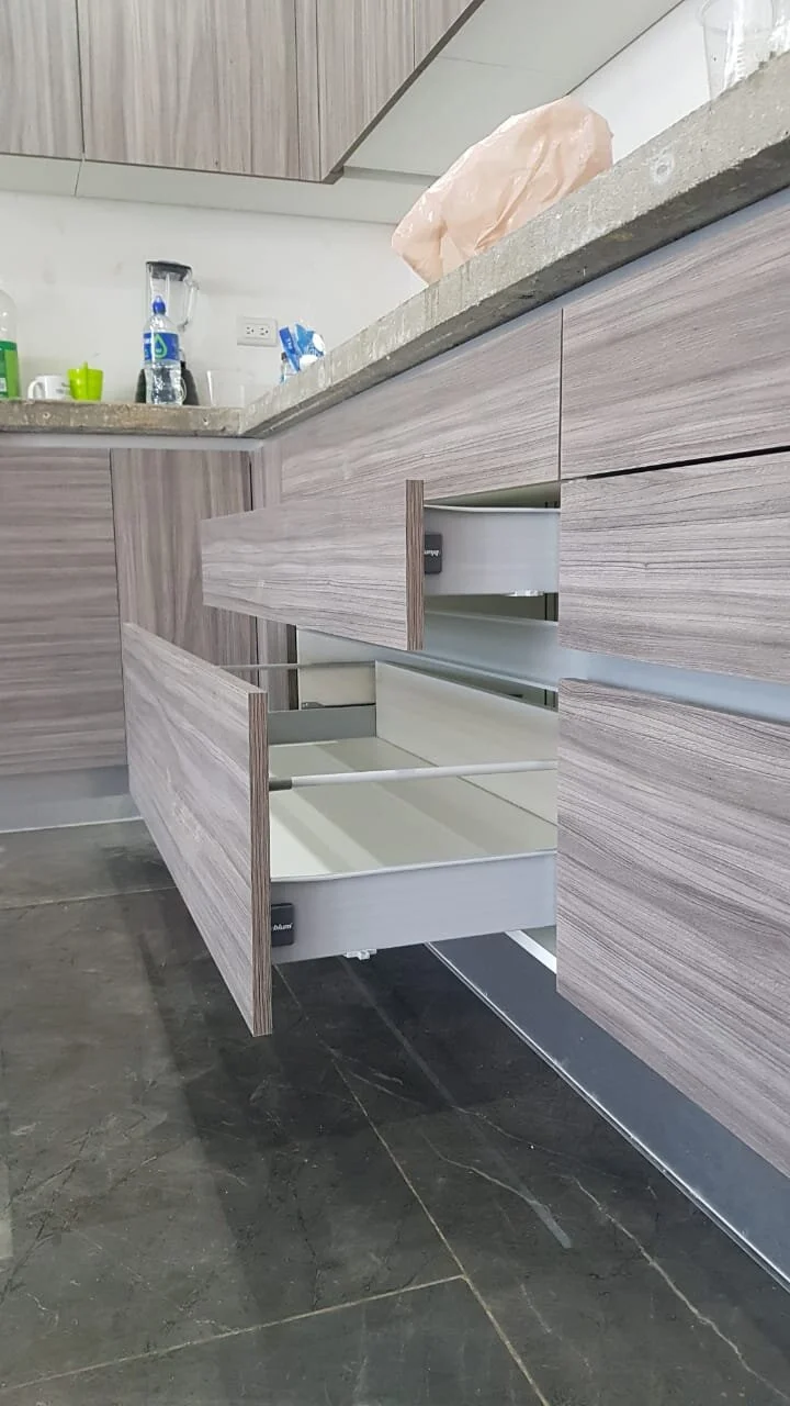 MUEBLE DE COCINA CON HERRAJES BLUM / CUERPOS DE LOS MUEBLES EN 18MM HIDROFUGO / CHAPETA 2MM / RODAPIE DE ALUMINIO / PATAS PLÁSTICAS / MÓDULOS ESPECIALES: BASURERO, ESPECIERO / TODO CON CIERRE LENTO / HERRAJE GOLAS / RODAPIE EN ALUMNIO / PUERTAS CON BISAGRAS SOFT CLOSE